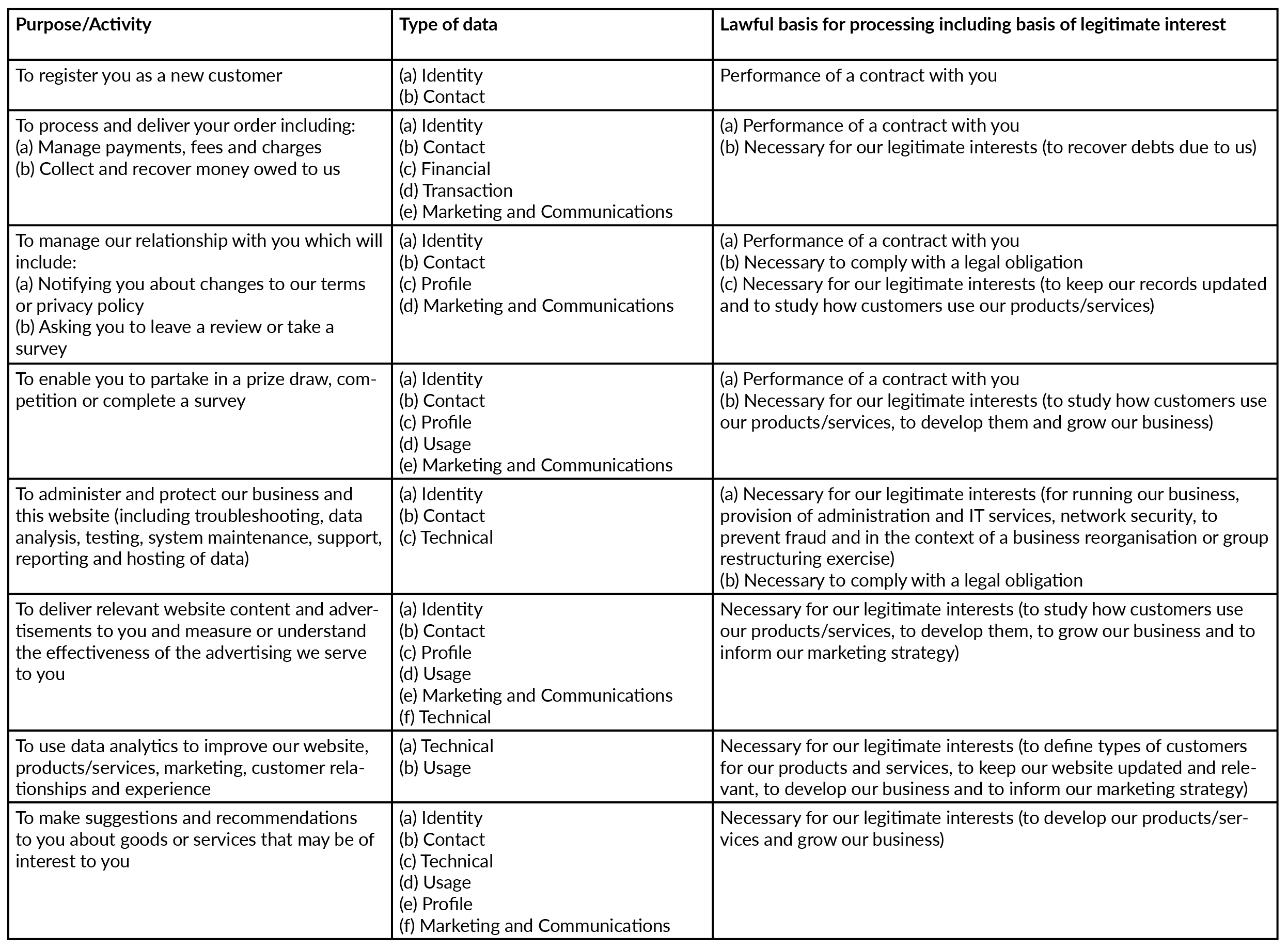 Legitimate Interest means the interest of our business in conducting and managing our business to enable us to give you the best service/product and the best and most secure experience. We make sure we consider and balance any potential impact on you (both positive and negative) and your rights before we process your personal data for our legitimate interests. We do not use your personal data for activities where our interests are overridden by the impact on you (unless we have your consent or are otherwise required or permitted to by law). You can obtain further information about how we assess our legitimate interests against any potential impact on you in respect of specific activities by contacting us. Performance of Contract means processing your data where it is necessary for the performance of a contract to which you are a party or to take steps at your request before entering into such a contract.